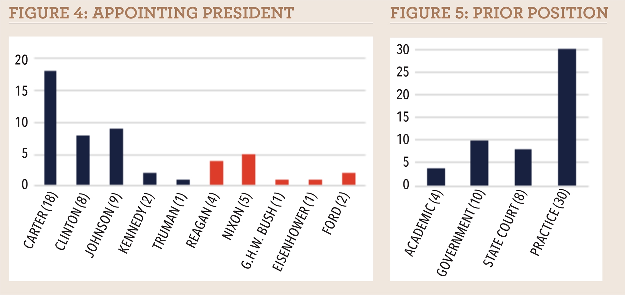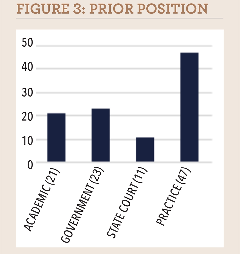 Figure 5. Prior Position. Most district judges came from private practice. Four came from the legal academy: Weinstein taught at Columbia; Pollak taught and was dean at Yale and Penn; Thelton Henderson (Central District of California, senior judge,) taught at Stanford and Golden Gate University; and Israel Glasser (Eastern District of New York, senior judge) was a faculty member and dean at Brooklyn Law School.