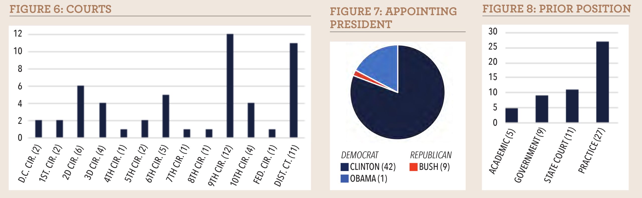 Figure 1. Courts. The Ninth Circuit’s lead is unsurprising, as it is the largest regional circuit, with 29 approved active judgeships — more judges means more clerks, which means more future academics from among those clerks. The D.C. Circuit is regarded as the “junior Supreme Court” and the most prestigious circuit,15 from which we would expect legal academics to emerge. The circuits represented expands going down the list of judges.